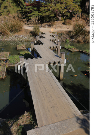 栗林公園、西湖南端の睡竜潭にかかる雁行形の八つ橋「津筏梁」を西側から見る