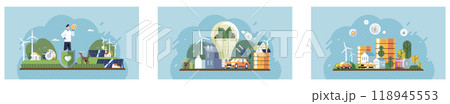 Energy efficiency. Various sustainable practices like solar panels, wind turbines, people, cities, and garden plants. Ideal for promoting eco-friendly living, renewable energy, sustainable urban