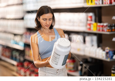 Adult woman buying jar of sports nutrition