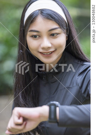 Indonesian southeast asian woman in a sporty outfit is checking her watch while practicing exercise in a public park outdoors. Concept of a Healthy active lifestyle