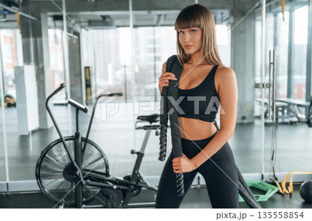 Active cross fit exercise with knots. Young woman is in the gym