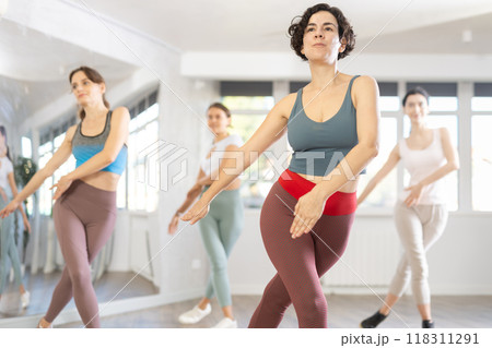 Woman with female perform dance in heels, squat down, actively repeat movements of instructor.