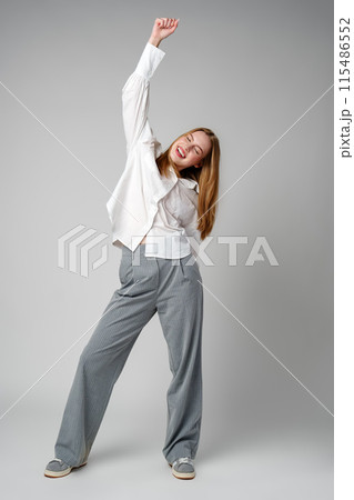 Jubilant Young Woman Celebrating a Victory With a Raised Fist in Studio