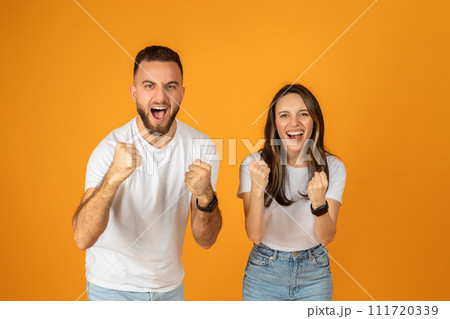 A man and woman in white t-shirts and blue jeans excitedly clench their fists and scream in victory