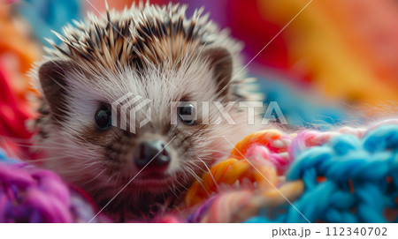 鮮やかなボケ味の円の中に遊び心のあるハリネズミのポートレート、楽しい表情。