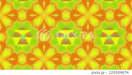 Image of kaleidoscopic colourful orange, yellow and green shapes moving hypnotically in a seamless l