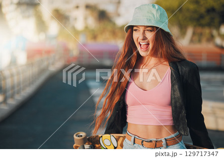 Smile, health and skateboard with woman in city for freedom, sports and relax lifestyle. Training, fitness and sunset with girl walking in urban town enjoying adventure, wellness and skating vacation