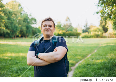 Happy 30s blonde man with backpack standing in the countryside. Traveler. Summer time. Positive handsome male with arms crossed in blue t-shirt standing outdoor