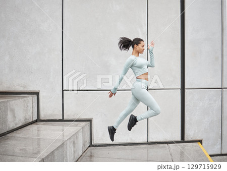 Running stairs and jump of a black woman doing training, sport and exercise with energy. Jumping, runner and morning fitness of woman doing sports, workout and cardio by steps for health and wellness