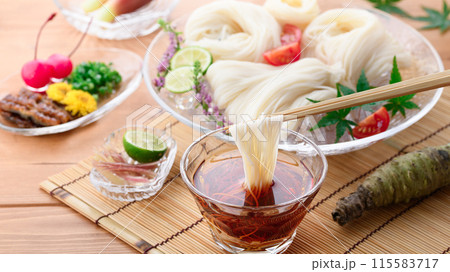 素麺桶に盛り付けたそうめん 夏イメージ