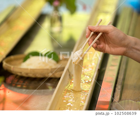 日本の流しそうめん。そうめんを箸で持ち上げてる様子。夏の風物詩。