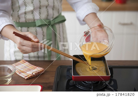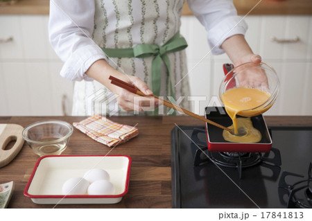 出汁入り卵液を玉子焼き器へ流し入れる女性