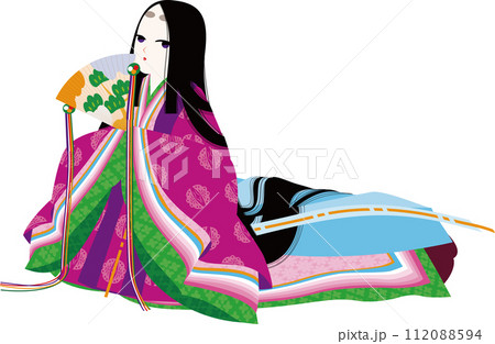 檜扇をもった流し目の十二単衣の女性キャラクターのイメージイラスト
