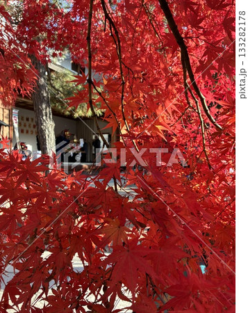 秋祭りの日の紅葉と宮司(11月 長野県松本市 四柱神社)