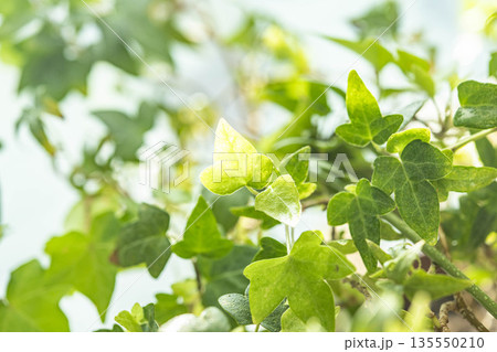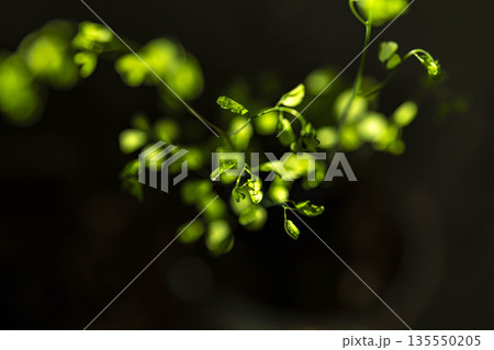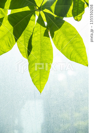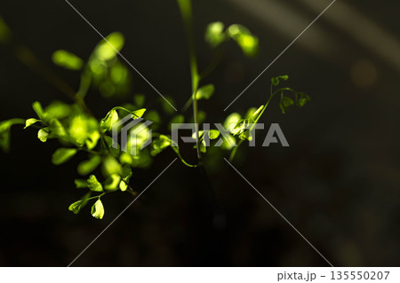 朝日を浴びてキラキラと輝く観葉植物