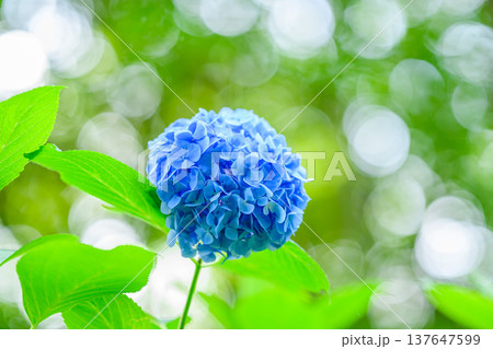 雨上がりの光に輝くあじさいと水滴、美しい玉ボケの背景