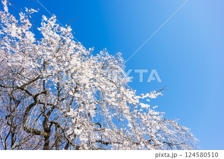 青空と枝垂桜風景 浄専寺 「天然記念物 樹齢300年以上を誇るしだれ桜」宮崎県西臼杵郡五ヶ瀬町