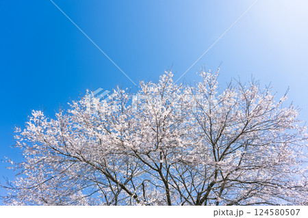 春空と桜の木風景「天然記念物 樹齢300年以上を誇るしだれ桜がある浄専寺」宮崎県西臼杵郡五ヶ瀬町