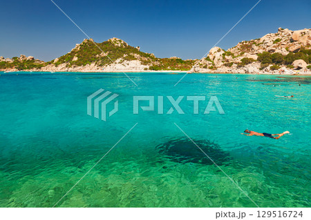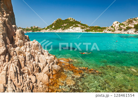 Snorkeling in clear turquoise waters of Cala Corsara on Spargi Island in Sardinia