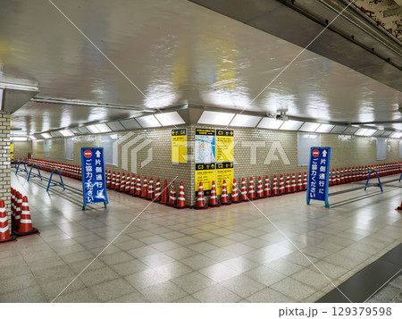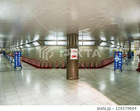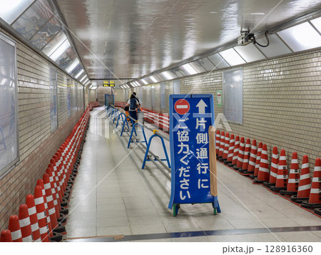 バリケードで規制された片側通行の地下歩道(東京都中央区 浅草橋交差点横断地下歩道)