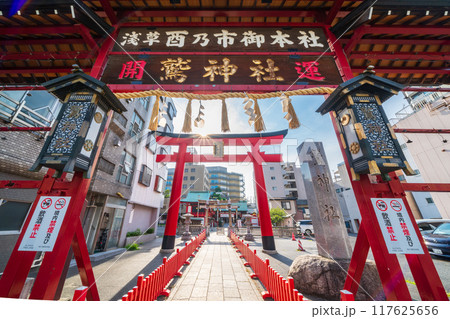 [東京・浅草] 酉の市の際に提灯を飾る鷲神社の鳥居のクローズアップ撮影。