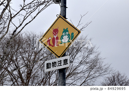 赤いキツネと緑のタヌキ道路標識