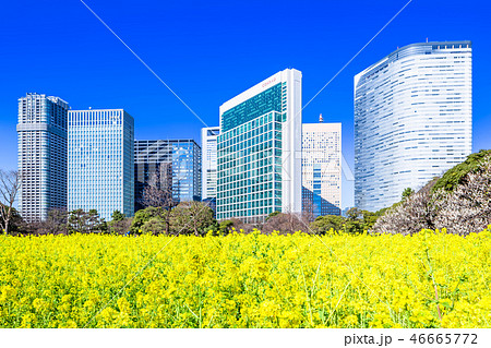 「東京都」東京汐留の高層ビルと浜離宮恩賜庭園の菜の花