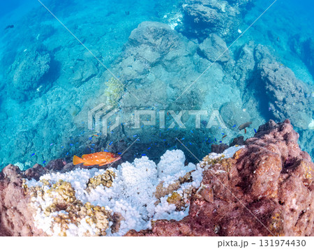 白化現象が見られるイソギンチャク畑に住む可愛いクマノミペア、ミツボシクロスズメダイ他の群れ。ヒリゾ浜