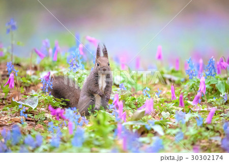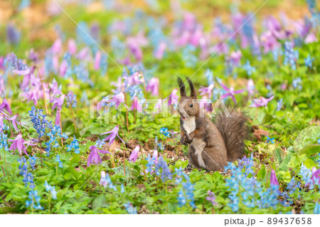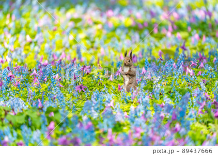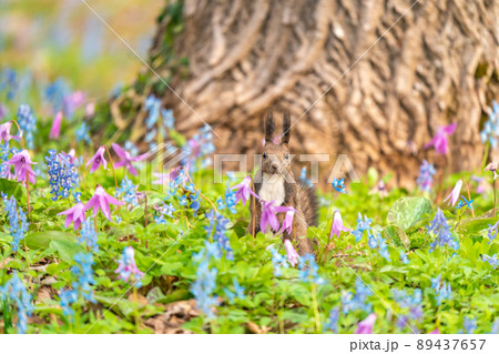 ファンタジーのようなメルヘン花畑のエゾリス 北海道浦臼神社