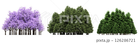 group of trees isolated on a transparent background, big trees in the forest, 3D illustration, cg render