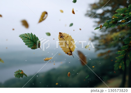 Colorful leaves swirling in the breeze near a serene landscape during autumn season