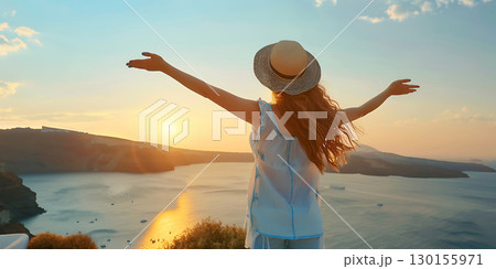 Woman feeling free at during sunset background, World Tourism Day - Ai Generated