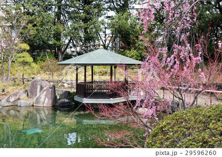 目白庭園の枝垂れ桜と六角浮き見堂(4月)東京都豊島区