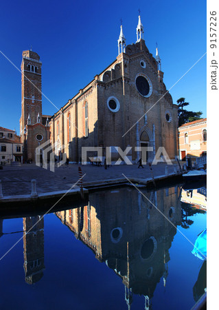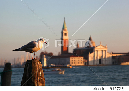 Venice, Italy. Seagull on pole against blurred panorama view of Chiesa di San Giorgio Maggiore or San Giorgio Maggiore island