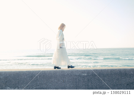 堤防を歩く若い女性
