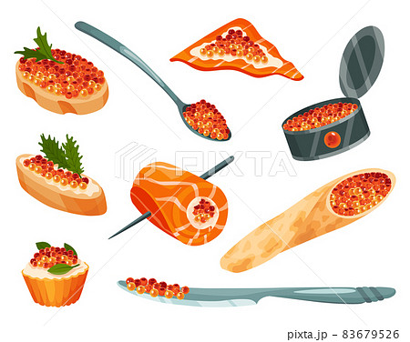 Delicious caviare snack and canape, pancakes, roll and sandwich with canned caviar. Seafood product of red fish and sturgeon or fish from the salmon family. Gourmet food close up, appetizers