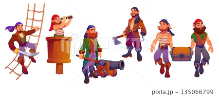 Cartoon pirate crew characters with axe, saber weapons, telescope, treasure chest and cannon. Group of funny bearded corsairs. Vector swashbucklers and sailor adventure game or storytelling personages