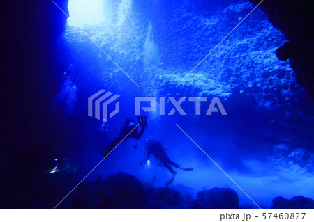 宮古島市下地島にあるダイビングスポットの海底洞窟の女王の部屋で泳ぐダイバー達