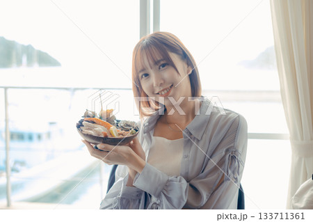 海鮮丼を手にした旅先でのひとこま