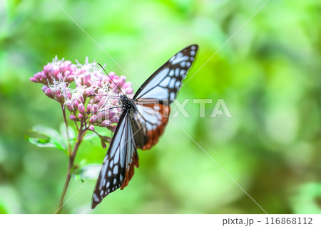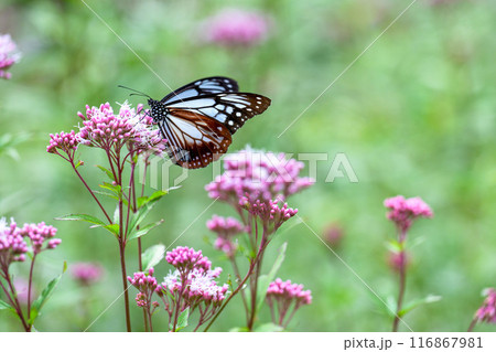 ピンクのフジバカマにとまる渡りの蝶アサギマダラ