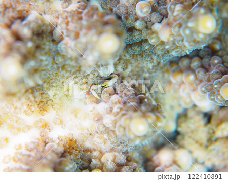白化現象のテーブルサンゴに住む可愛いヒメサンゴガニ他。静岡県伊豆半島賀茂郡南伊豆町中木ヒリゾ浜