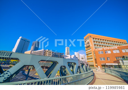 日本の横浜都市景観 歩道橋のある街…新港サークルウォークや横浜ランドマークタワー、あかいくつ…