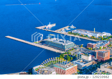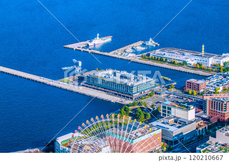 日本の横浜都市景観 横浜赤レンガ倉庫や大さん橋、新港サークルウォークなどを望む
