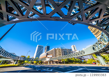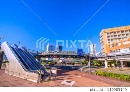 日本の横浜都市景観 歩道橋のある街。みなとみらいの新港サークルウォークや新港中央広場のエスカレーター