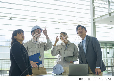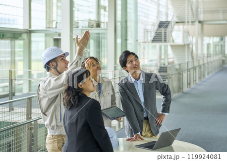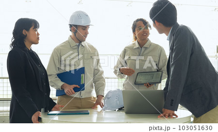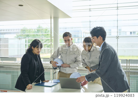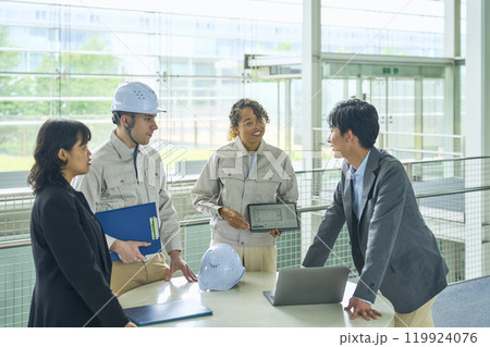 ビル内で会議する多国籍エンジニアとビジネスパーソンのグループ