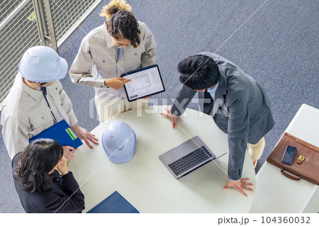 ビル内で会議する多国籍エンジニアとビジネスパーソンのグループ 俯瞰アングル