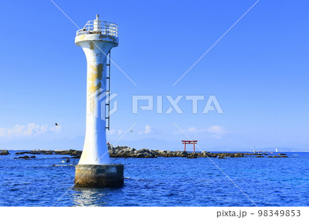 灯台と鳥居の見える海(森戸海岸)