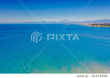 快晴の富士山と江ノ島を海より望む、マリンブルーの海と富士山のドローン写真、海上からの空撮
