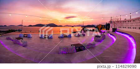 View of rooftop bar in Panwa beach at sunset, in Phuket, Thailand