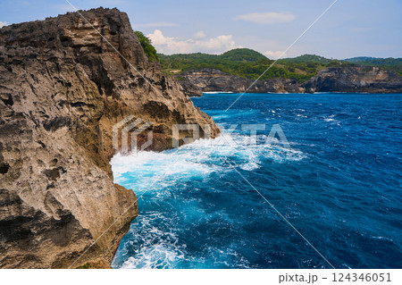 Coastline with cliffs, rock and surfing waves in Bali. Scenic landscape in Indonesia
